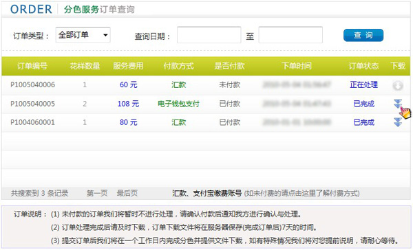 第二步,進(jìn)入訂單中心后可以查詢訂單的狀態(tài)和以前的訂單信息,點擊下載圖標(biāo)即可進(jìn)入‘訂單的詳細(xì)信息’進(jìn)行分色稿文件的下載。