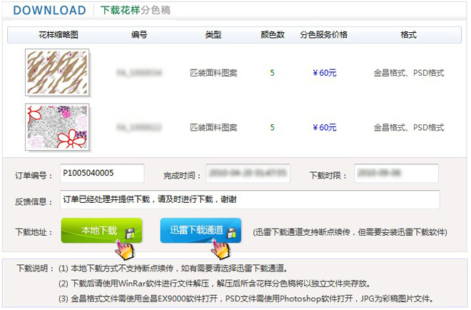 第三步,進(jìn)入‘下載花樣分色稿’頁面后可選擇‘本地下載’及‘迅雷下載’兩種方式。