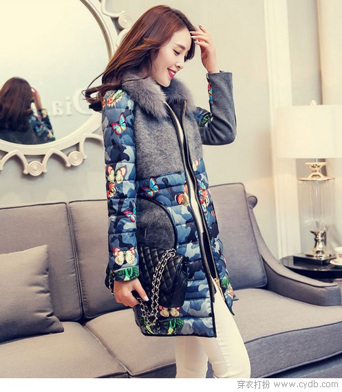 蝴蝶飛來了,落在了一直不起眼的羽絨服上,讓人覺得冬天不那么無聊。貂絨拼接,高級灰期待你的別樣演繹。迷彩印花的方式改變了色彩,藍色系似乎更加溫婉,與蝴蝶翩翩飛舞的情愫遙相呼應(yīng)。