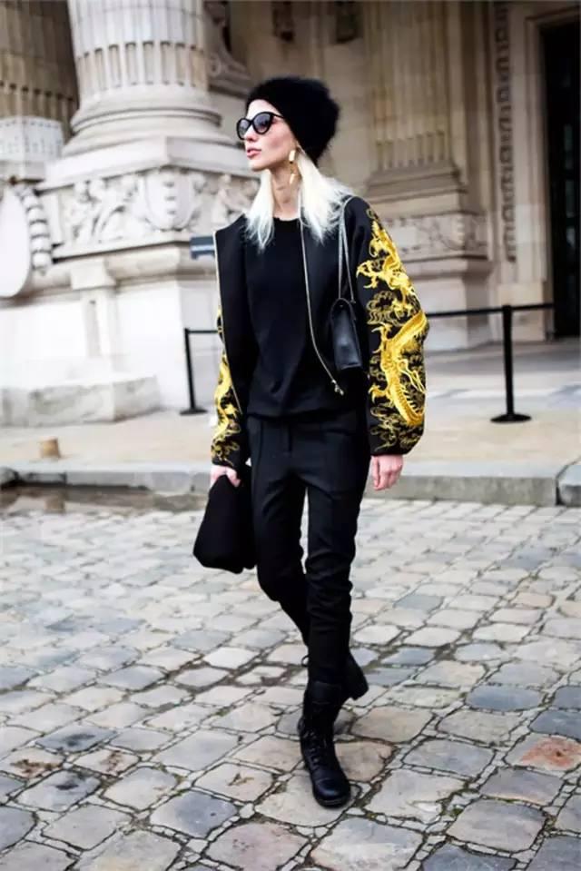 覺得五顏六色太花俏太娘也很正常,穿不好也很容易淪為ldquo;村妹子rdquo;,既然如此就不冒險了,選皮革和絲絨拼接的oversized夾克衫唄,袖子的金色刺繡元素讓全黑造型的酷勁兒更足了~