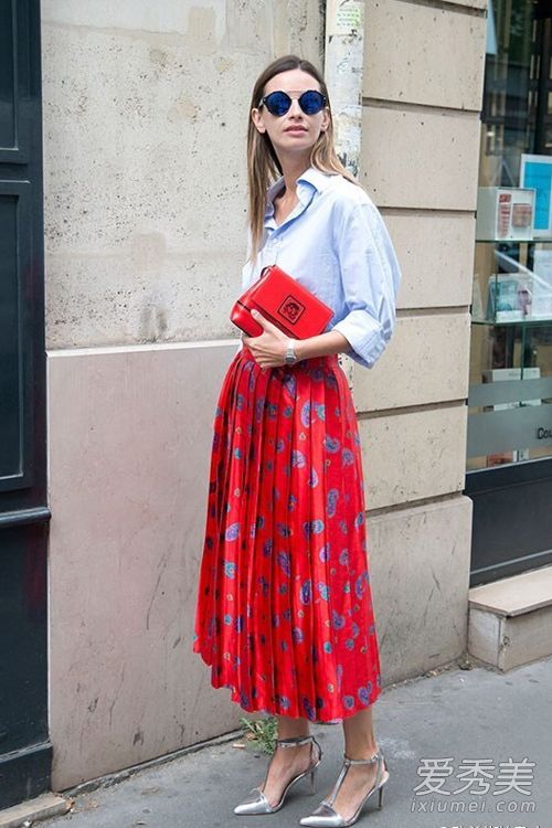 淺藍(lán)襯衫知性又帥氣,配紅色印花百褶長裙瞬間變得女人味十足,優(yōu)雅精致,帶著復(fù)古氣息。