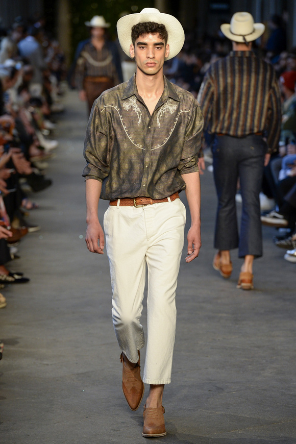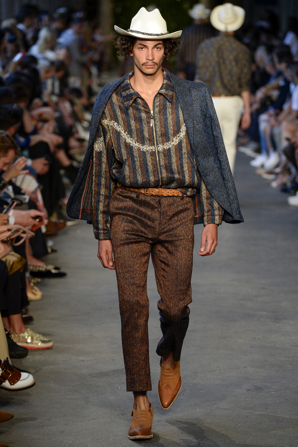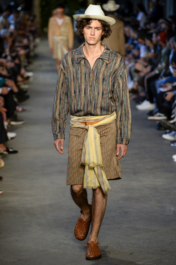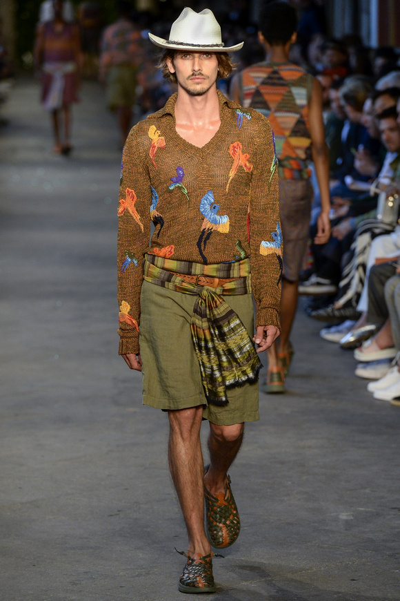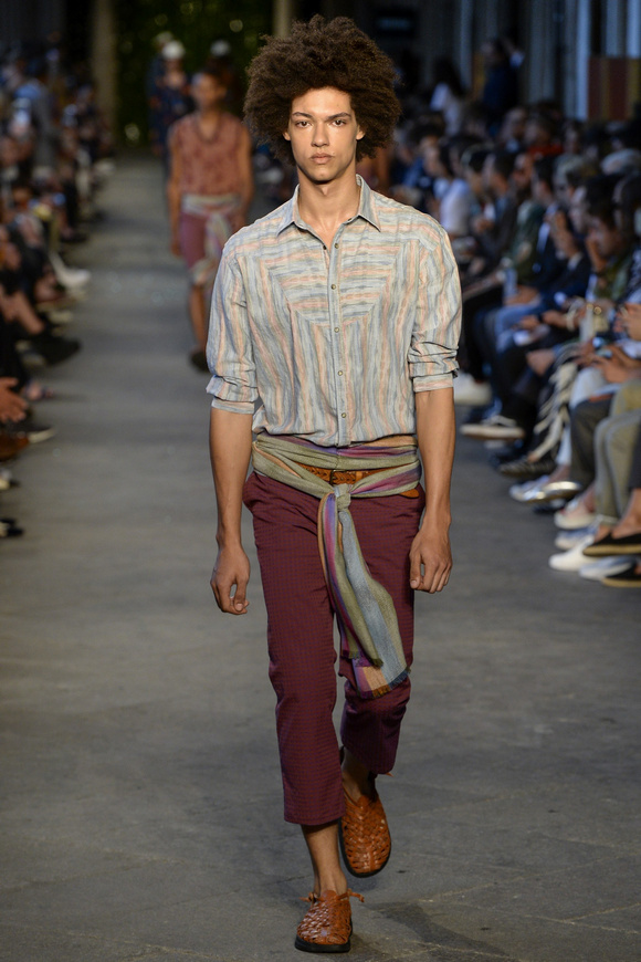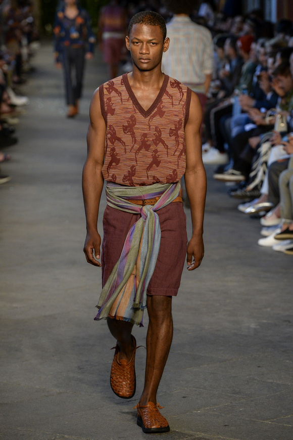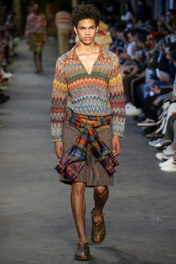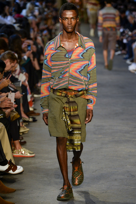 Missoni獨特的密集的萬花筒的顏色似乎與南美洲的親和力的編織。依舊是精彩絢爛的民俗印花圖案。上半身是一個松散的襯衫、下半身是易于裝配的針織短褲,西裝。拉鏈運動衫和襯衫在Missoni三角形渲染編織穿插布雷頓條紋汗衫。寬編織皮涼鞋,吊綁上棕色麂皮則有一些美式牛仔風(fēng)情。開場時白色和靛藍(lán)牛仔布到后來更豐富的編織。這是一個豐富的春夏系列。