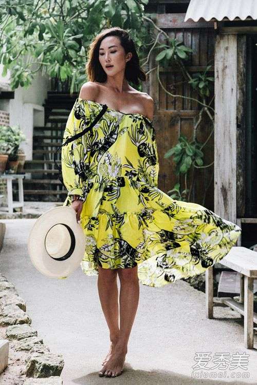 抹胸收腰的印花連衣裙配尖頭高跟鞋,清新明媚的黃色印花絢爛又不張揚(yáng),穿出性感高貴名媛風(fēng)。
