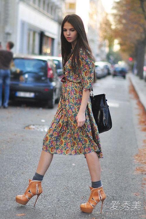 波西米亞風(fēng)的印花連衣裙復(fù)古浪漫,配高跟鞋靴子和棉襪,細(xì)節(jié)處彰顯搭配功力。