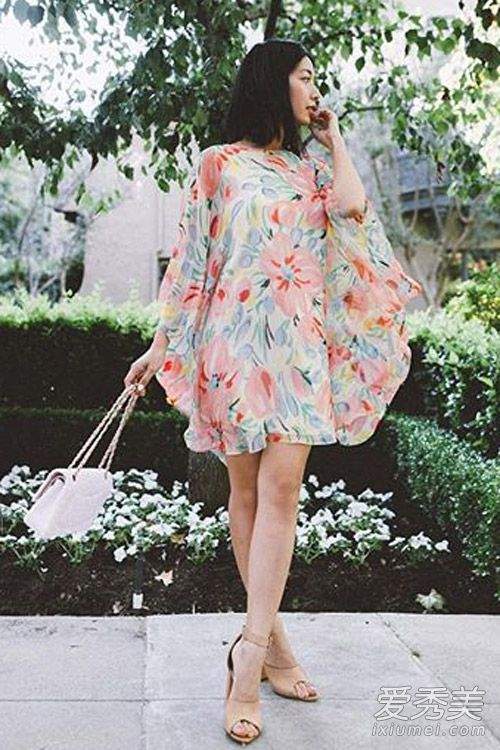 輕盈飄逸的印花雪紡裙,精致的斗篷款式,粉藍(lán)、粉紅色大花美不勝收,宛如翩翩起舞的蝴蝶仙子。