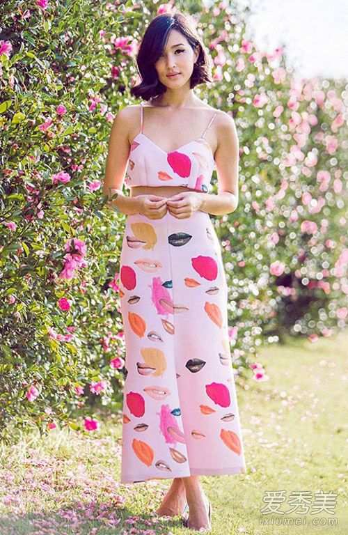 吊帶上衣配高腰長(zhǎng)裙,主色調(diào)是淡淡的粉色,格外柔美,點(diǎn)綴時(shí)尚的紅唇圖案,個(gè)性俏皮,將性感與甜美完美結(jié)合。