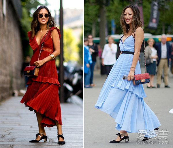 荷葉裙讓簡單的搭配也能大放異彩,博主Aimee Song即便是搭配了同樣的包和鞋,兩條荷葉邊的裙也能帶來兩個完全不同的效果。