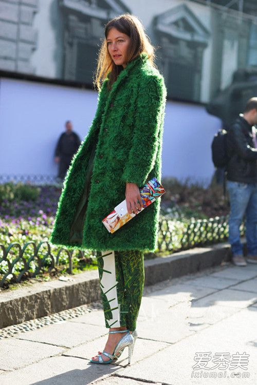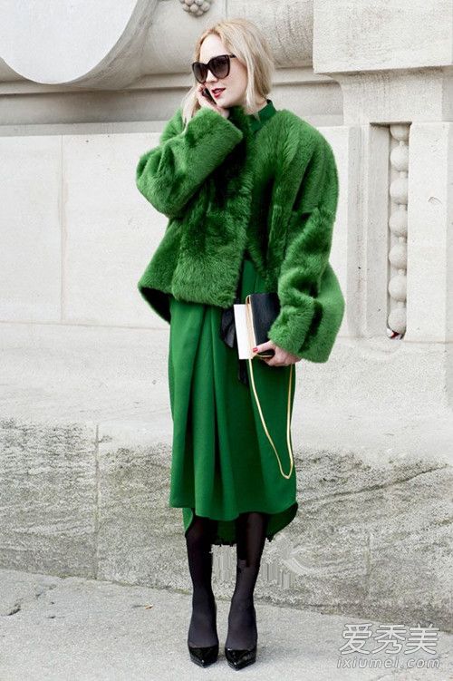 草木綠皮草外套,搭上面的同色直筒褲或這種同色半身裙,但是好看又不沉悶的搭配。