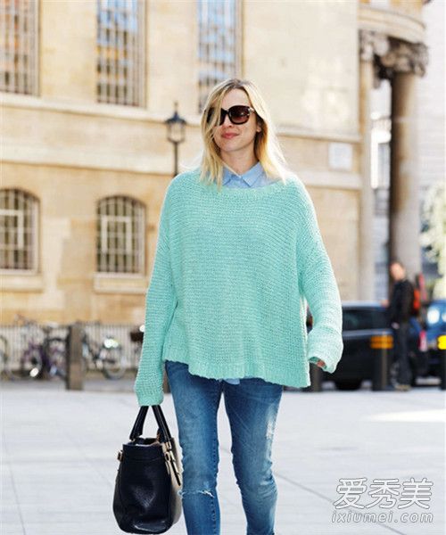 草木綠毛衣搭配藍(lán)色牛仔褲,清新又時(shí)髦。