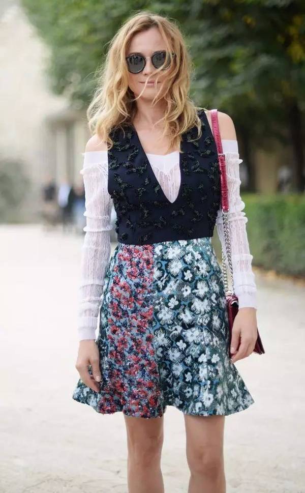 印花單品之所以容易給人廉價感,除了圖案比較復雜外,還在于風格太過甜膩,顯得不夠大氣耐看。因此你可以對癥下藥,搭配一些材質(zhì)挺括的中性單品,一方面中和了慣有的甜膩,提升造型質(zhì)感,還可以讓你又美又帥,盡展多面魅力。