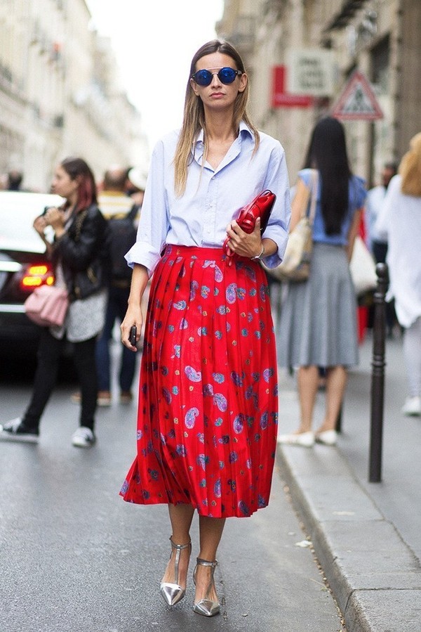 也可以選擇帶有顏色卻足夠清爽的藍襯衫與印花裙作搭配,搭出更出彩的撞色效果。