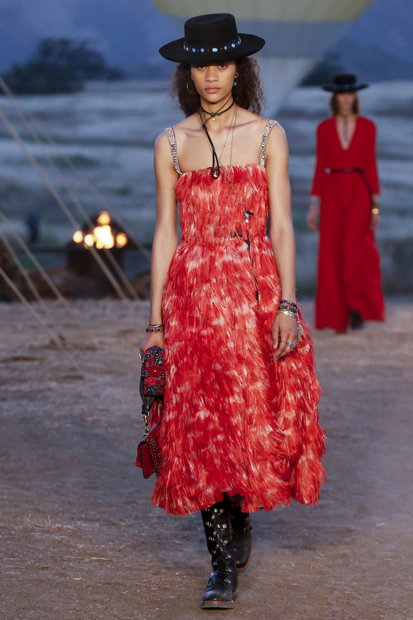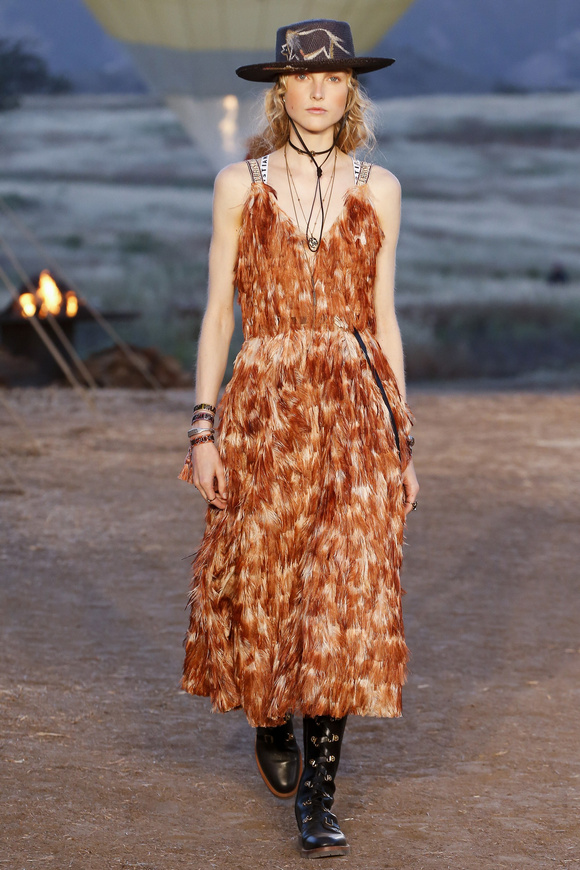 Chirstian Dior 克里斯汀 迪奧 這一季的時裝發(fā)布會挑在洛杉磯舉行,設(shè)計的靈感來自十年前在法國西南部的古代壁畫,要與自然的要素聯(lián)系在一起,譬如美洲獅、響尾蛇等等。裙子和披風(fēng)都有拉斯科草圖、酒椰葉纖維提花、塔羅牌的插圖、和柔軟的印花皮草、還有珠繡的牛仔也是一大兩點。