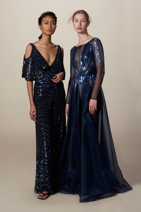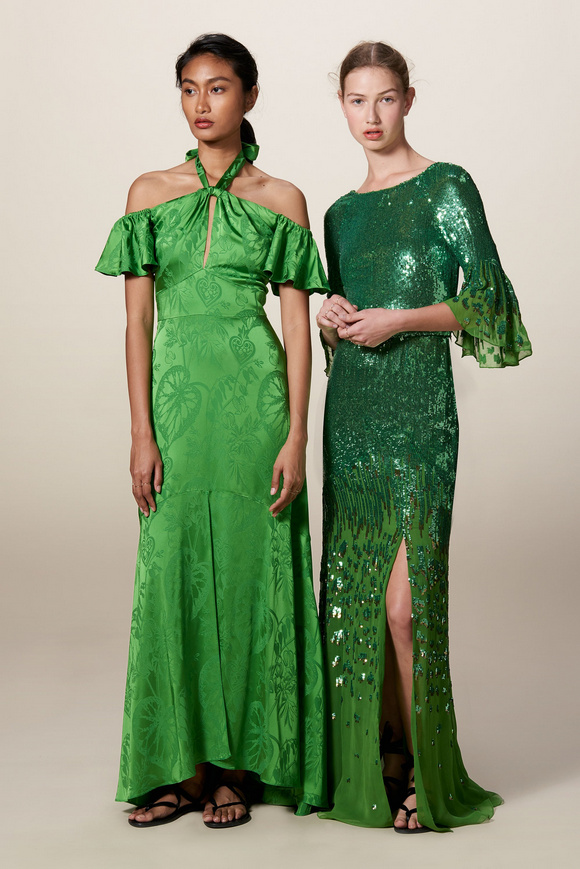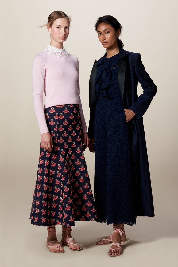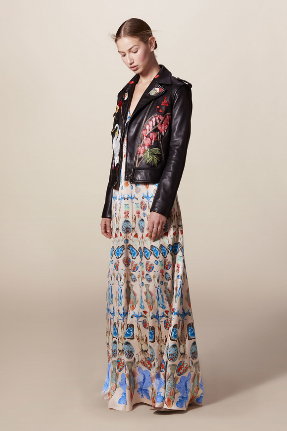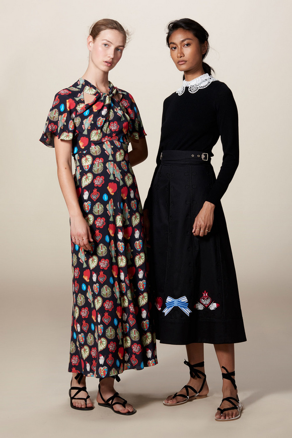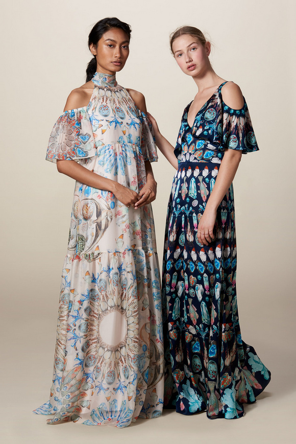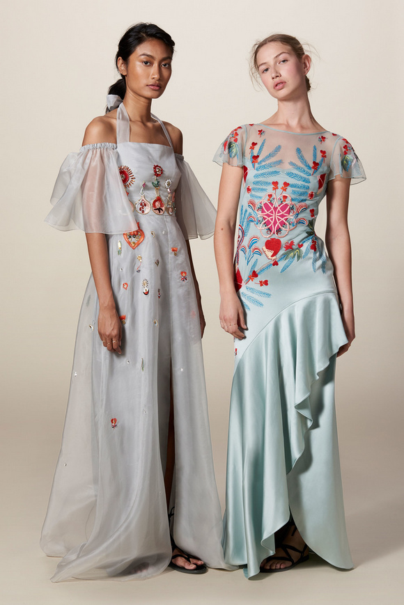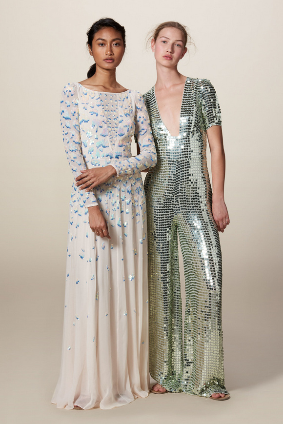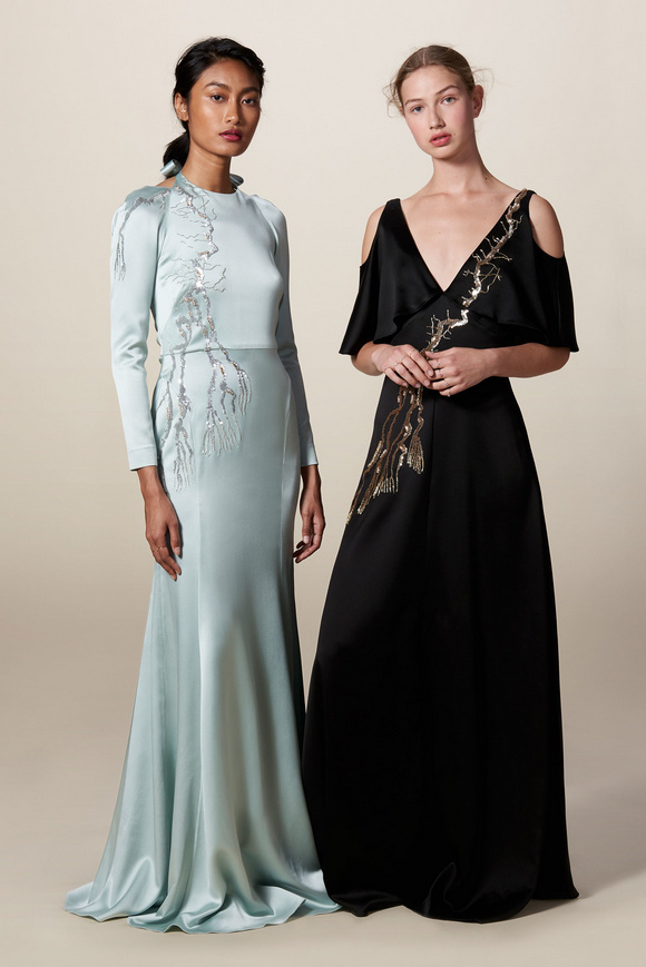Temperley London 坦波麗倫敦 這一季的休閑服裝的亮點(diǎn)包括魔法圖案、金屬貼壓花朵的魅力,還有密密麻麻的印花、煉金圖紙等。印花裙的特色是運(yùn)用更多的同心圓符文模式。寬腿褲和女巫袍更顯特色。花邊的衣服和領(lǐng)子細(xì)節(jié)顯示中世紀(jì)藥劑師的酒壺和軌道的行星。心形亮片閃閃發(fā)光的衣服和裙子,更在最后照片中,一個(gè)是開放的武裝連衣褲和皺褶的武裝打扮,微亮片從不透明變成藍(lán)色。